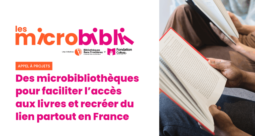 Du 22 octobre au 23 novembre, Bibliothèques Sans Frontières et la Fondation Cultura lancent leur 9ème appel à projets afin de créer et animer des microbibliothèques – appelées “microbiblis” – dans les territoires éloignés de la lecture ! Il est ouvert à toutes et tous : citoyens, associations, centres socio-culturels, médico-sociaux, commerçants…