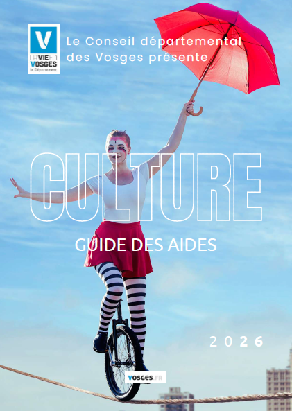 Le Guide des aides culturelles rassemble les différents dispositifs mis en place par le Conseil départemental des Vosges pour agir sur les territoires en faveur de la culture. Il constitue un outil qui permet de connaître les modalités d'interventions de financement de la collectivité départementale afin d'aider les acteurs culturels à monter leurs projets. Didactique, il se présente sous forme de fiches dispositifs qui indiquent les bénéficiaires, les montants et modalités d'attribution des aides. Vous trouverez plus de détails (pièces justificatives à fournir, coordonnées du contact, ...) dans la rubrique dispositifs/culture sur le site www.vosges.fr.