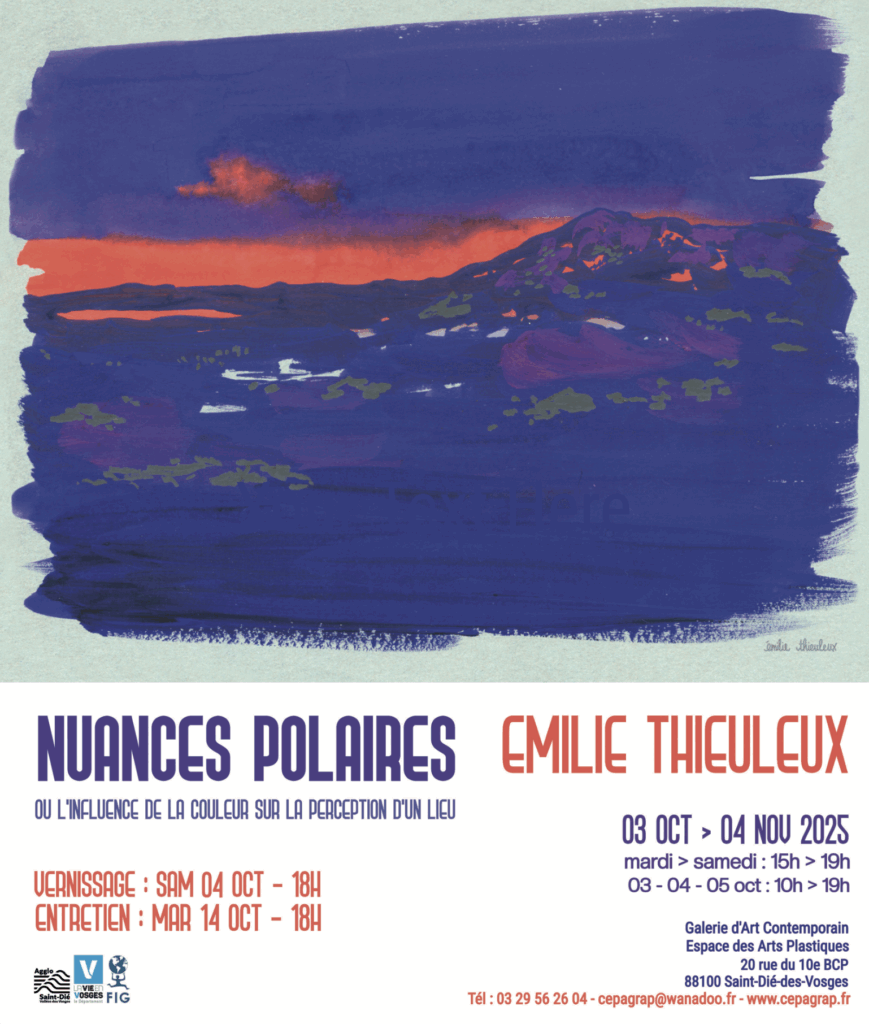 L’expositionNuances polaires ou l’influence de la couleur sur la perception d’un lieu met en lumière un travail de recherche visuel et plastique mené lors d’une résidence artistique de plusieurs semaines, sur une petite île kalaallisut d’à peine 10km2, située au-dessus du cercle polaire. Le Groenland est, dans l’imaginaire collectif, un immense territoire blanc bordé de bleu. Lorsque la nuit polaire est là, que la lune devient le soleil, le blanc n’existe plus, brouillant une perception profondément ancrée dans notre vision occidentale de ce territoire. Mais alors, la couleur peut-elle influencer notre perception d’un lieu, nourrir des avis et fantasmes qui participent de sa définition ? Durant la nuit polaire, quand le soleil ne franchit pas l’horizon, l’artiste Émilie Thieuleux a porté son regard sur les teintes perceptibles et tous les éléments qui participent à lidentité colorimétrique et forgent le caractère de ce territoire si particulier.Un relevé in situ des couleurs a permis de collecter plus de 200 nuances issues de cet environnement, ainsi qu’une collection de photographies, de dessins, peintures et illustrations qui tentent de transposer la force du quotidien vécu.