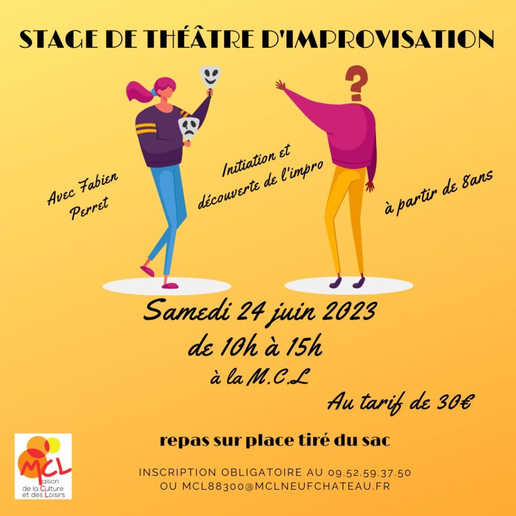 La Maison de la Culture et des Loisirs de Neufchâteau propose un stage de théâtre d’improvisation avec Fabien Perret. Initiation et découverte du théâtre d’impro pour se découvrir et se dépasser. Repas sur place avec pique-nique tiré du sac. Au tarif de 30€.