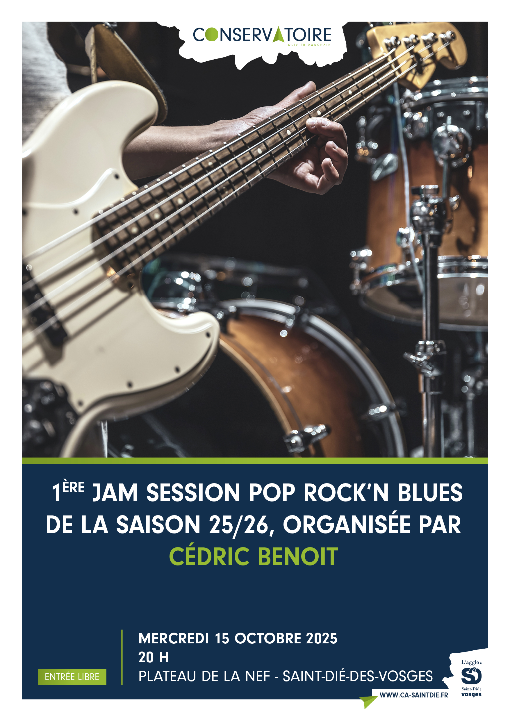 Le conservatoire vous propose la 1ère jam session pop rock’n blues de la saison. Organisée par Cédric Benoit, elle permet aux élèves, amateurs et professionnels de partager la scène. N’hésitez pas à nous rejoindre, mercredi 15 octobre à 20h, plateau de la Nef, entrée libre