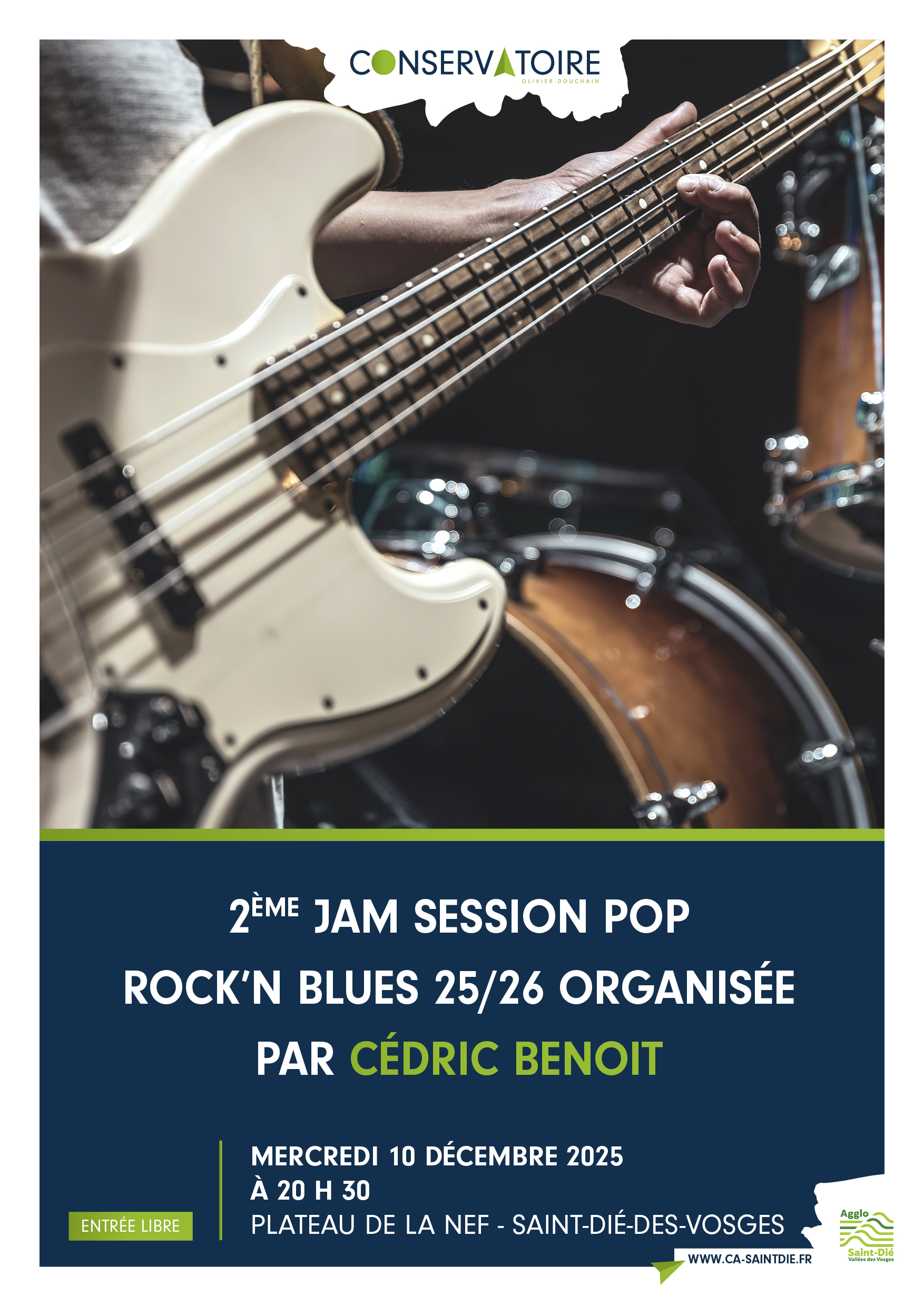 Le conservatoire vous propose la 2ème jam session pop rock’n blues de la saison 25/26, organisée par Cédric Benoit, 20h30, plateau de la Nef, entrée libre