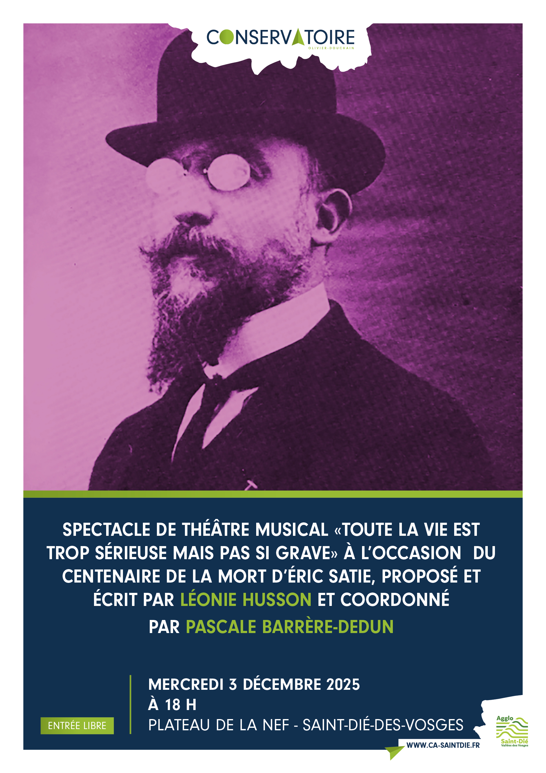 Le conservatoire vous propose « Toute la vie est trop sérieuse mais pas si grave », spectacle de théâtre musical à l’occasion du centenaire de la mort d’Érik Satie. Livret : Léonie Husson (ancienne élève du conservatoire), avec la participation des élèves des classes de piano, flûte traversière et guitare de Pascale Barrère-Dedun, Sébastien Perrin, Émilie Meistersheim, Cédric Boulogne et Marie-Laure Schmitt, 18h, plateau de la Nef, entrée libre