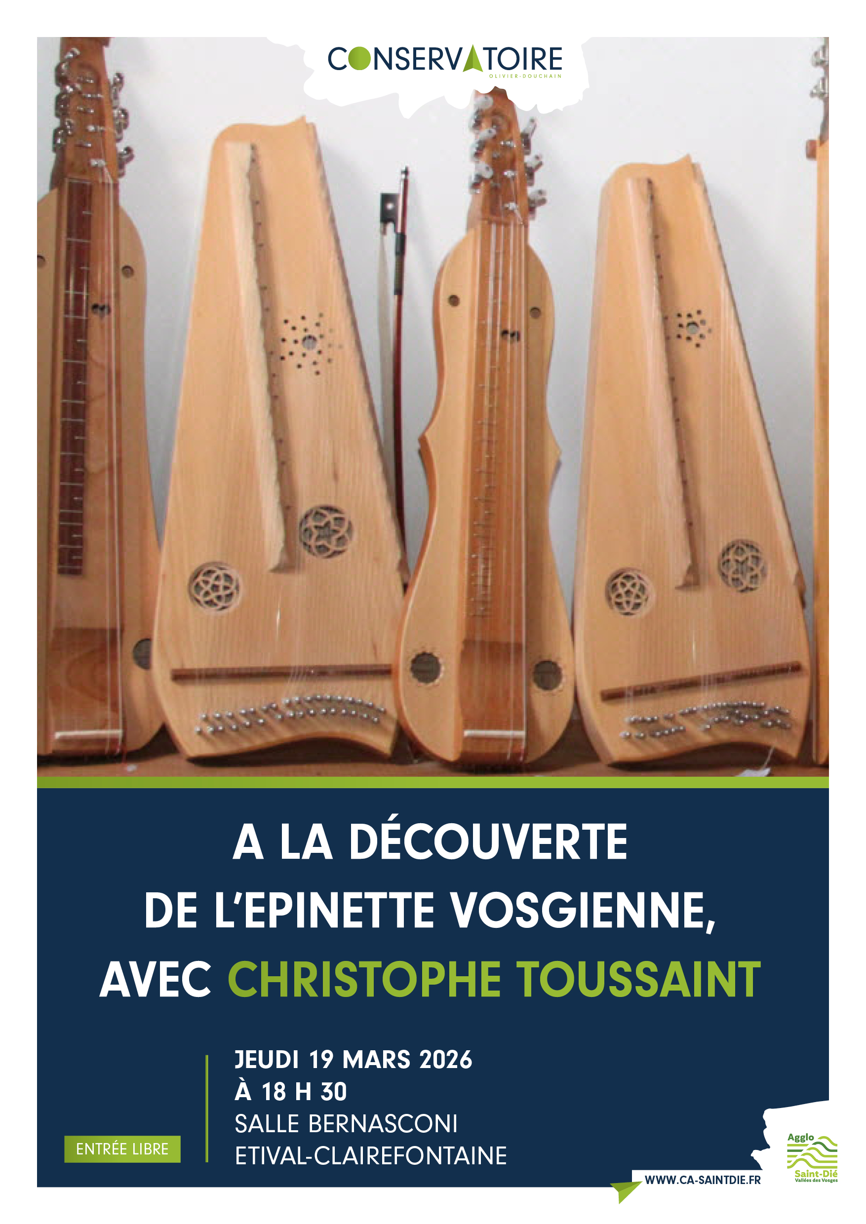 Le conservatoire vous propose de découvrir l’épinette vosgienne avec Christophe Toussaint et les élèves des classes de violon de Claire Thiébaut, de guitare d’Émilie Meistersheim, jeudi 19 mars à 18h30, salle Bernasconi d’Étival-Clairefontaine, entrée libre