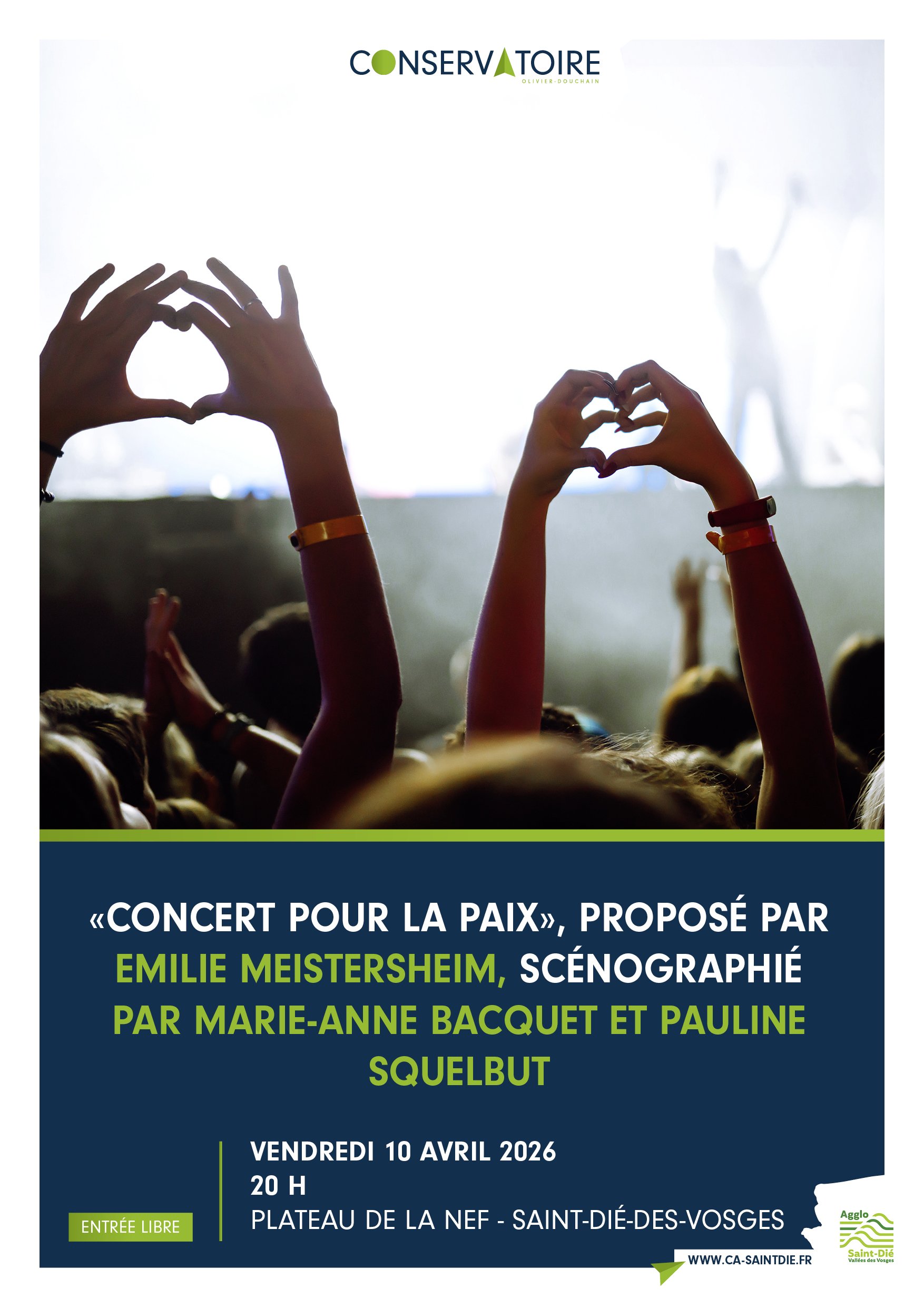 Le Conservatoire vous propose un « Concert pour la Paix », coordonné par Émilie Meistersheim, avec la participation de plusieurs classes et scénographié par Marie-Anne Bacquet et Pauline Squelbut, vendredi 10 avril, 20h, plateau de la Nef, entrée libre