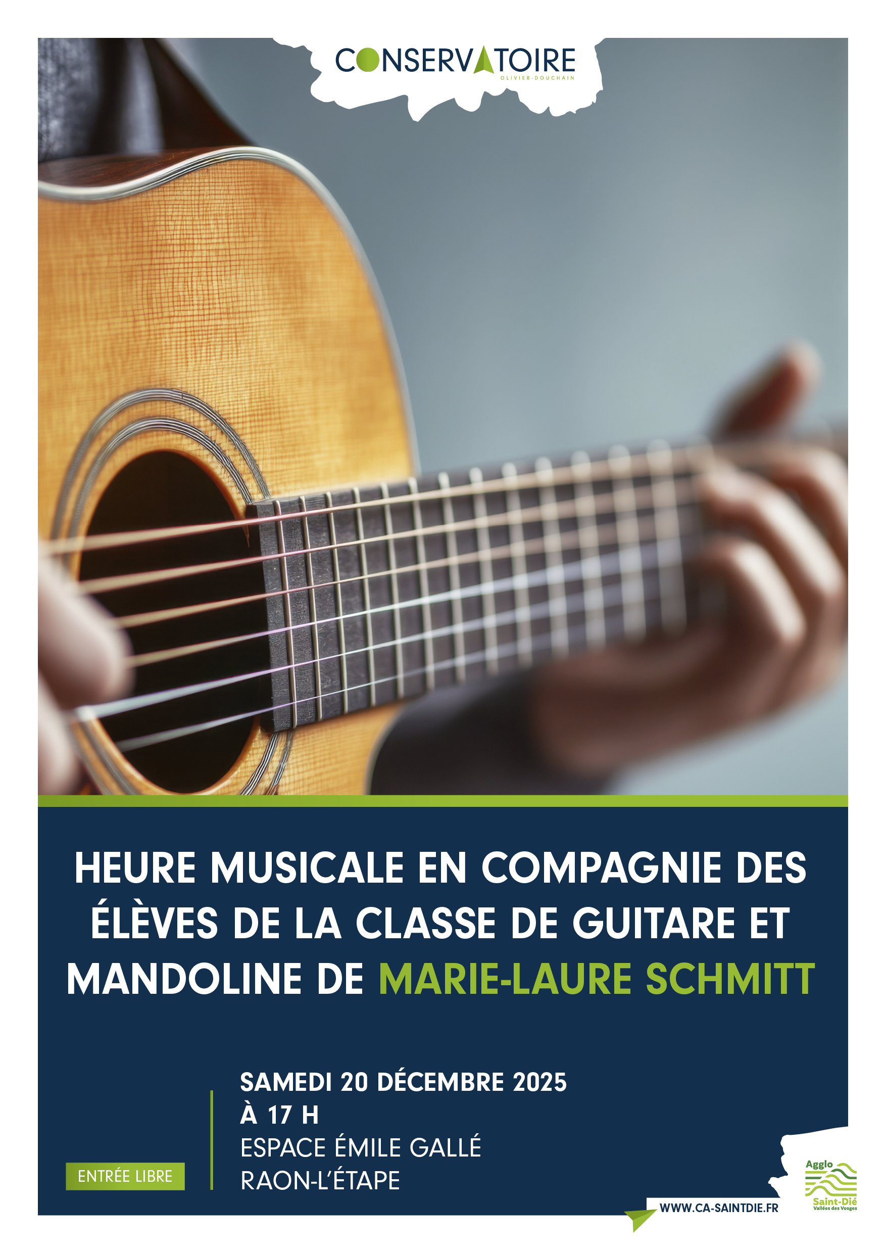 Le conservatoire vous propose de passer une Heure Musicale en compagnie des élèves de la classe de guitare et mandoline de Marie-Laure Schmitt, samedi 20 décembre, 17h, espace Émile Gallé, entrée libre