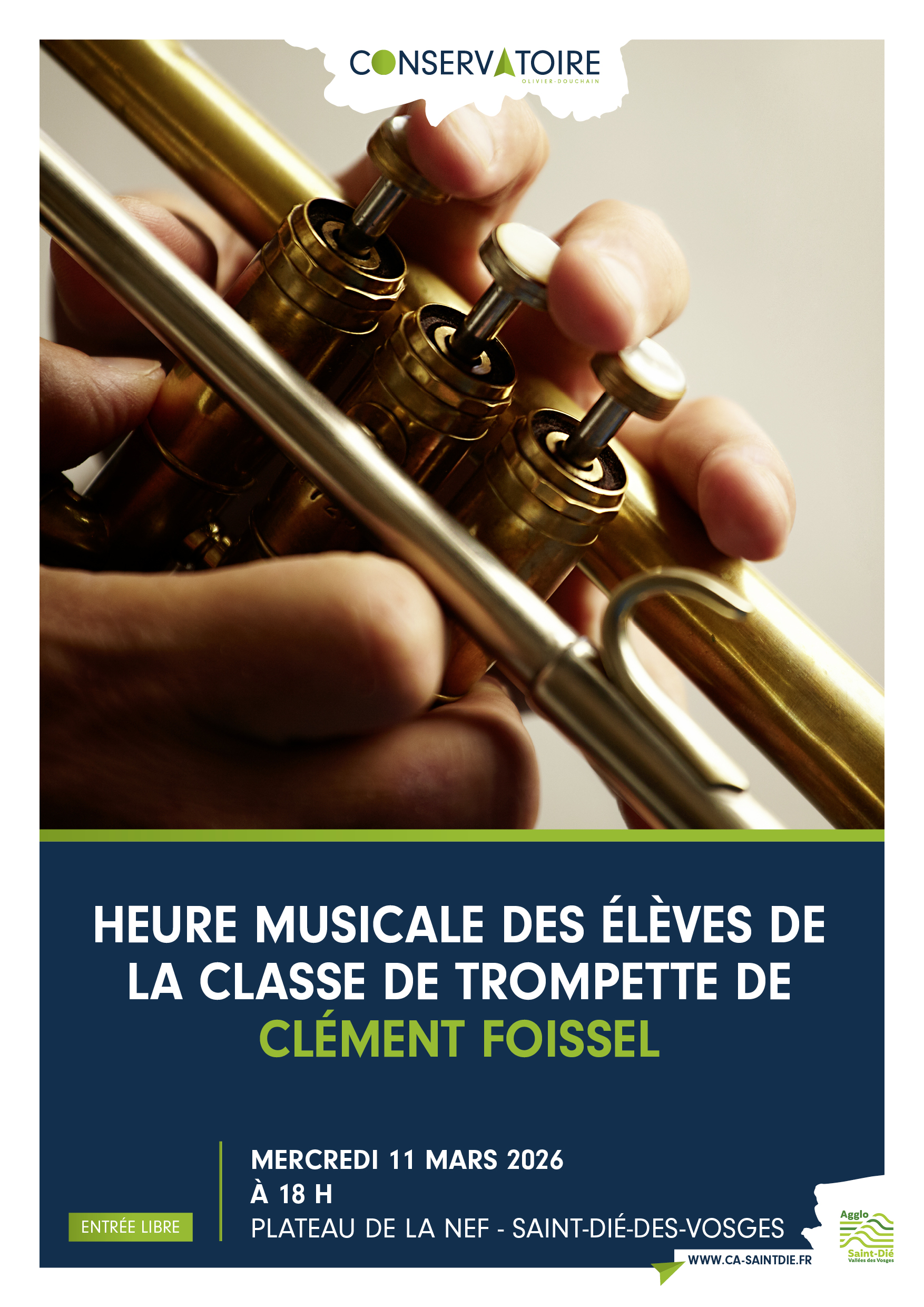Le conservatoire vous propose de passer une Heure Musicale en compagnie des élèves de la classe de trompette de Clément Foissel, mercredi 11 mars à 18h, plateau de la Nef (64 rue des 4 frères Mougeotte à Saint-Dié-des-Vosges), entrée libre