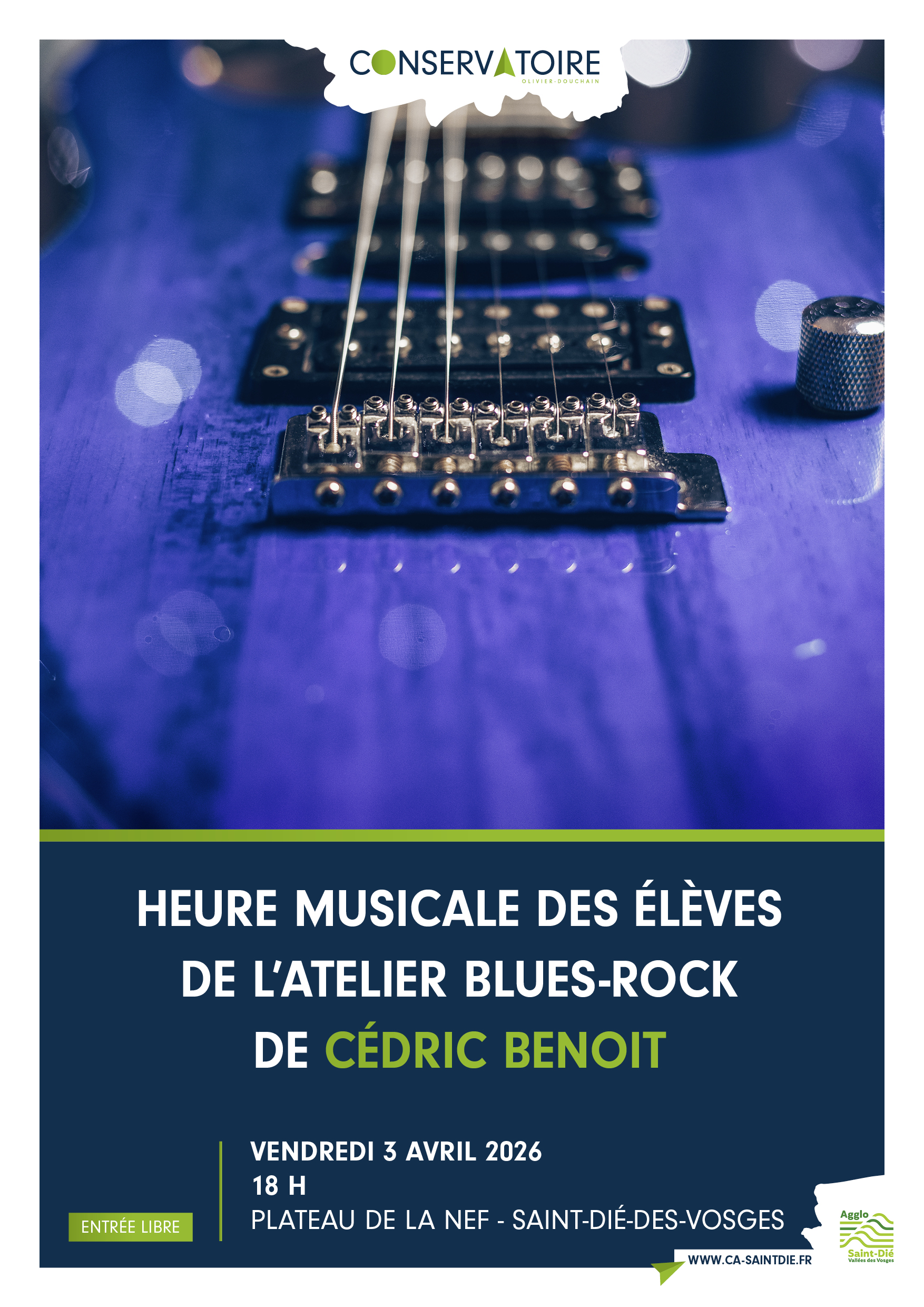 Le conservatoire vous propose de passer une Heure Musicale en compagnie des élèves de l’atelier blues-rock de Cédric Benoit, vendredi 3 avril à 18h, plateau de la Nef, entrée libre