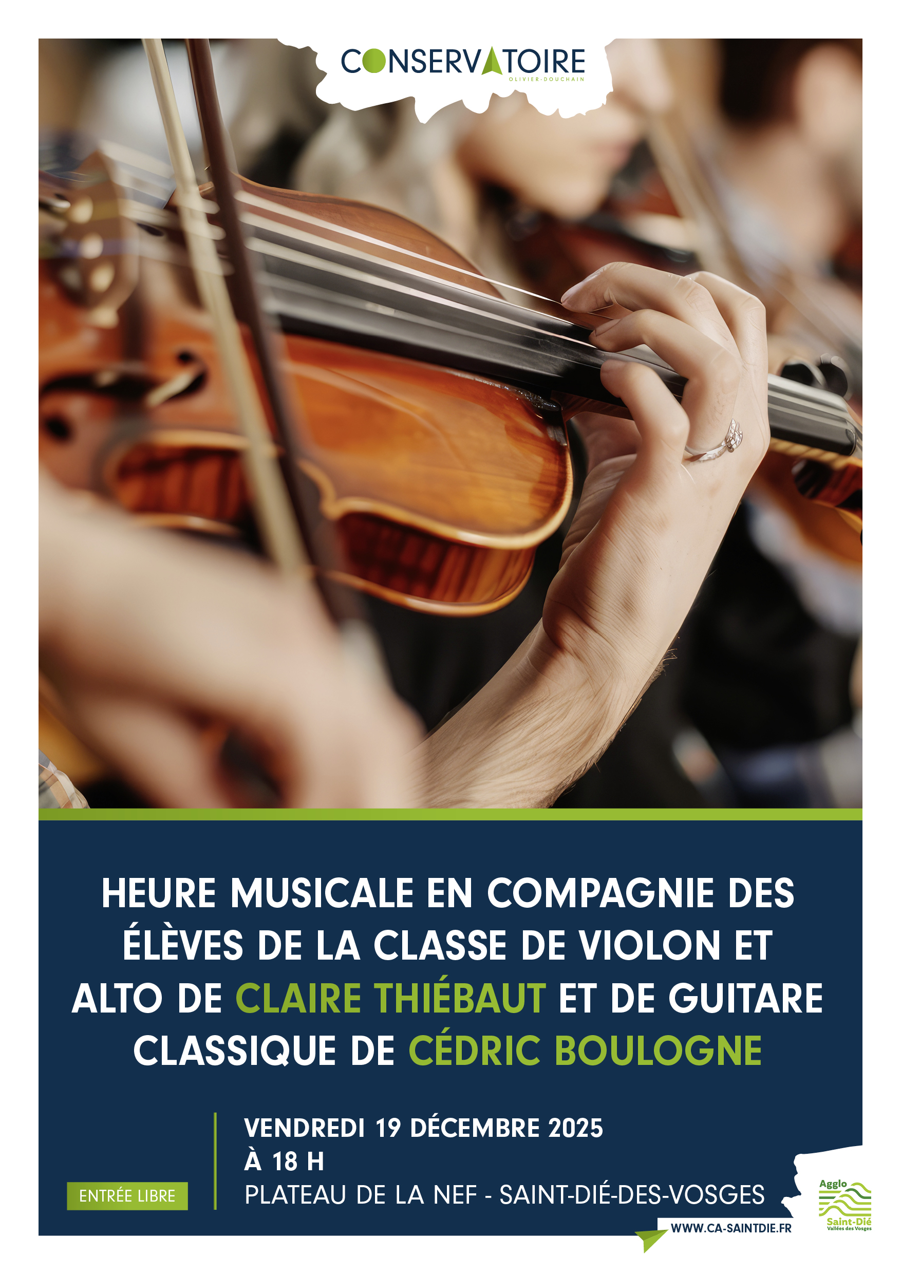 Le conservatoire vous propose de passer une Heure Musicale en compagnie des élèves des classes de violon, alto et guitare de Claire Thiébaut et Cédric Boulogne, vendredi 19 décembre, 18h, plateau de la Nef, entrée libre