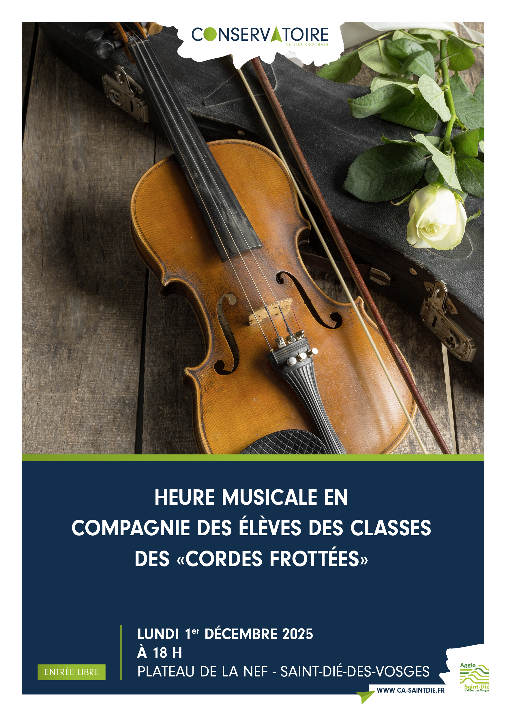 Le Conservatoire vous propose de passer une Heure Musicale en compagnie des élèves des classes des cordes frottées (violon, alto, violoncelle et contrebasse), lundi 1er décembre, 18h, plateau de la Nef, entrée libre