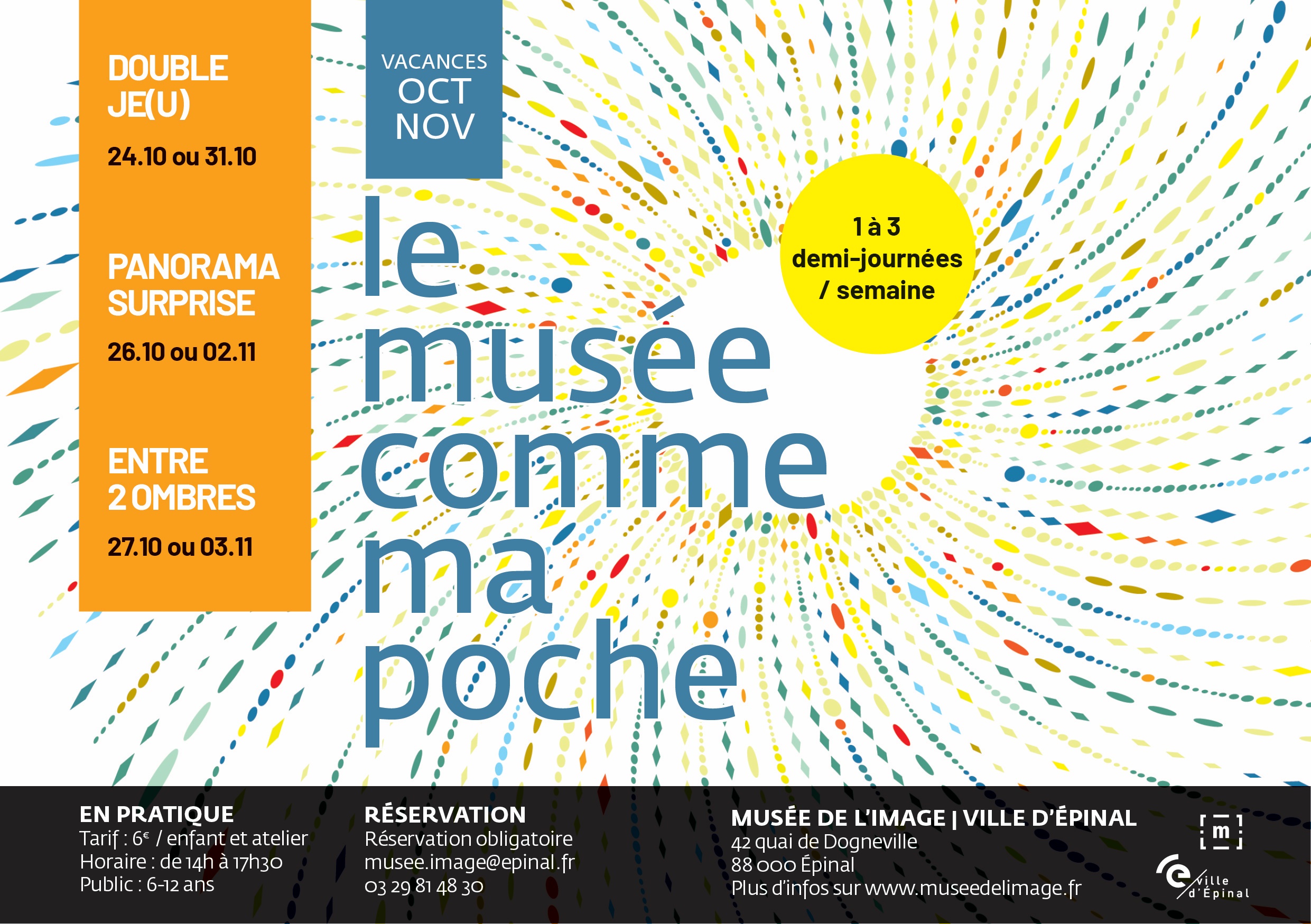 LE MUSÉE COMME MA POCHE, le rendez-vous des vacances pour les enfants ! Soit 3 demi-journées d’atelier par semaine pour créer et s’amuser autour de l’exposition Plein la vue ! À chaque jour, son thème et sa technique :