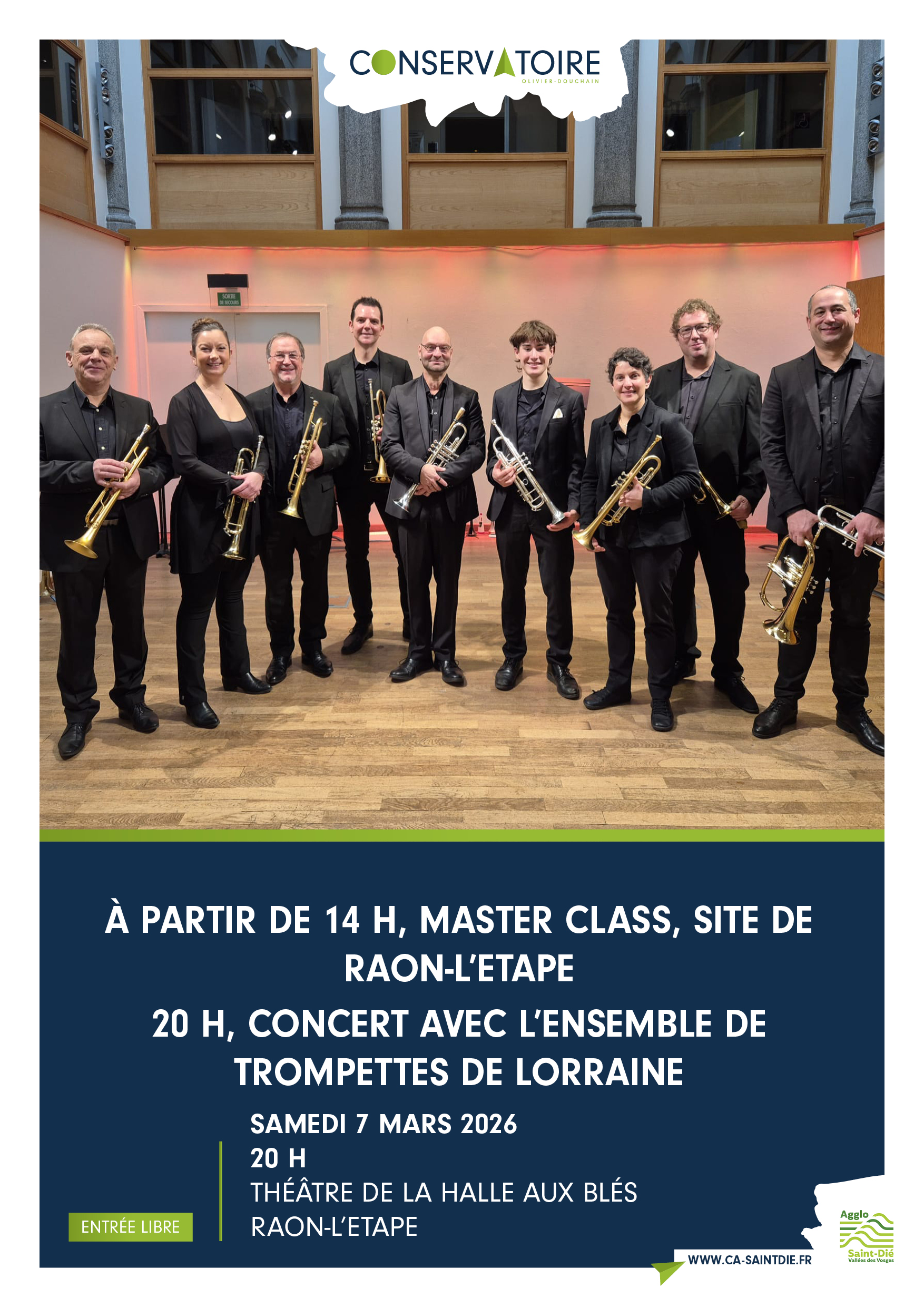 Le Conservatoire vous propose samedi 7 mars 2026 d’assister à une master-class et à un concert avec l’Ensemble de trompettes de Lorraine. Master-class à partir de 14h sur le site de Raon-l’Étape et concert à 20h au Théâtre de La Halle aux Blés à Raon-l’Étape, entrée libre