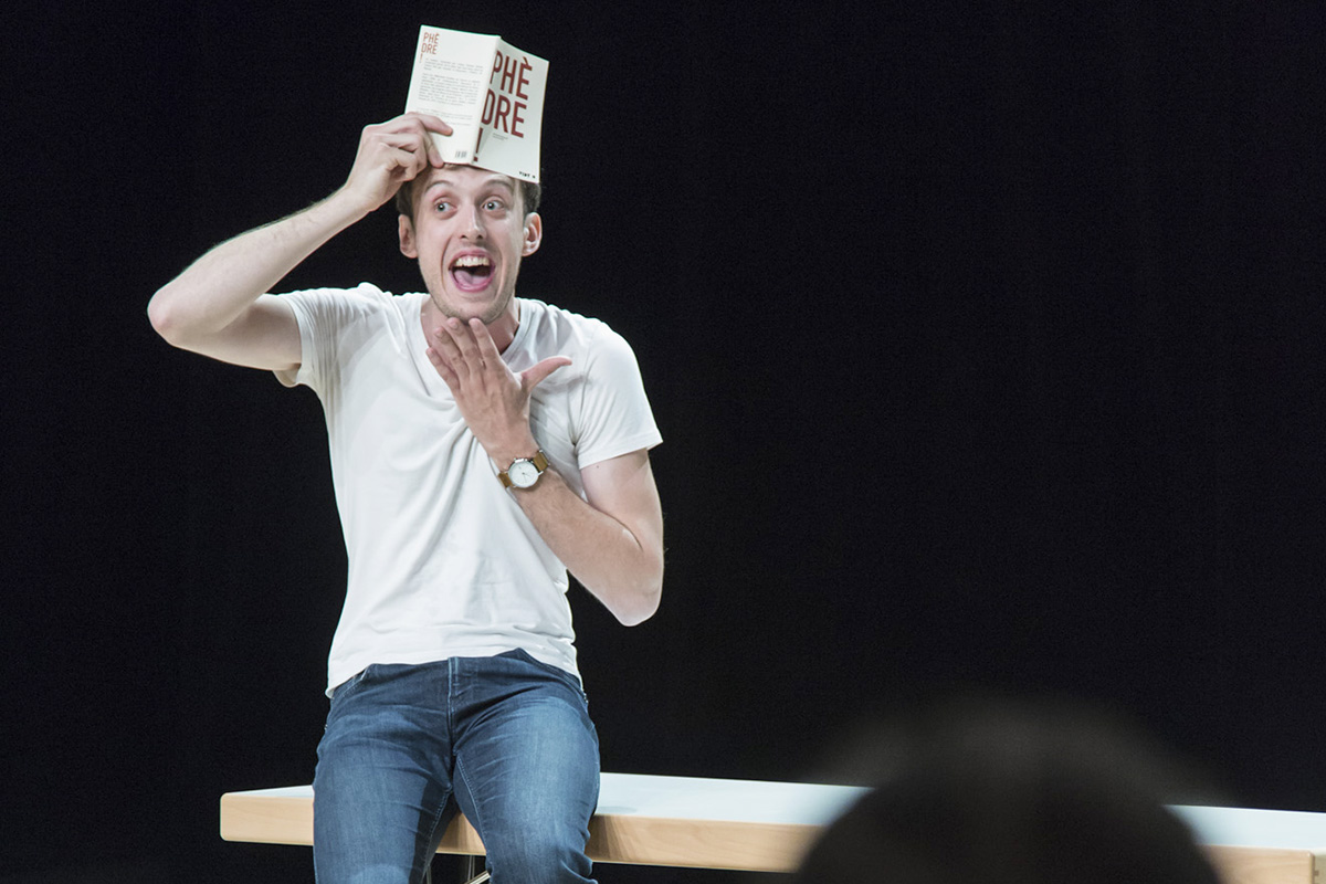 Bien sûr, on le devine, il est question de Phèdre, la plus fameuse et plus jouée des tragédies de Racine. Pourtant, bien que son principal sujet, elle n’est pas le véritable sujet de ce spectacle. Ce dernier se cache sous le point d’exclamation, ce signe de ponctuation qui, au temps de Racine, était appelé point d’admiration. En effet, le véritable sujet de Phèdre ! est l’admiration que son unique protagoniste voue à la tragédie de Racine. Ici la tragédie se mue en un monologue joyeux. Avec emphase, Romain Daroles nous dévoile sa passion pour les amours contrariées entre l’épouse du roi d’Athènes et son beau-fils. L’érudition n’est pas soluble dans l’humour et c’est un véritable précis de théâtre classique qui nous est révélé : généalogie mythologique, vertus de l’alexandrin, notion de catharsis…