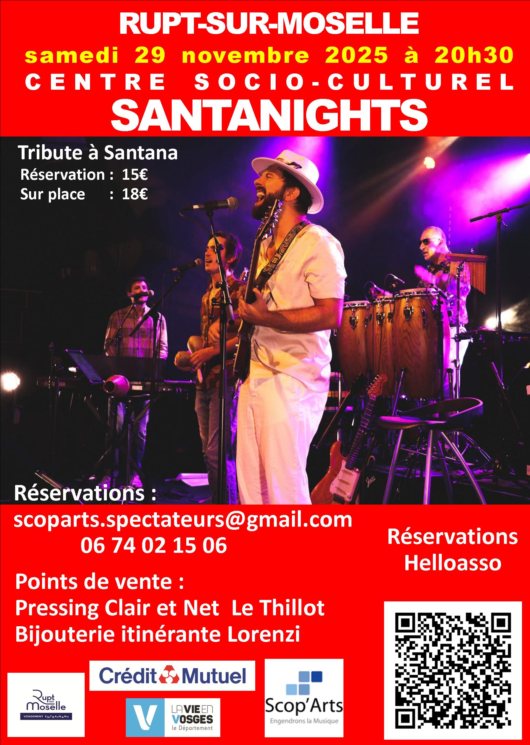 Au programme : un voyage musical ensoleillé entre rock, blues, jazz et sonorités latines, porté par des musiciens passionnés Santanights  c’est l’énergie et la passion de sept musiciens chevronnés, dont la plupart ont fait leurs armes dans les conservatoires d’Alsace. Après un travail intensif et passionné, ils ont su capturer le son et le groove emblématique du légendaire groupe Santana et de son guitariste mythique. Leur répertoire riche et varié oscille entre les plus grands standards et des pépites moins connues, promettant une expérience musicale aussi dynamique qu’inoubliable.