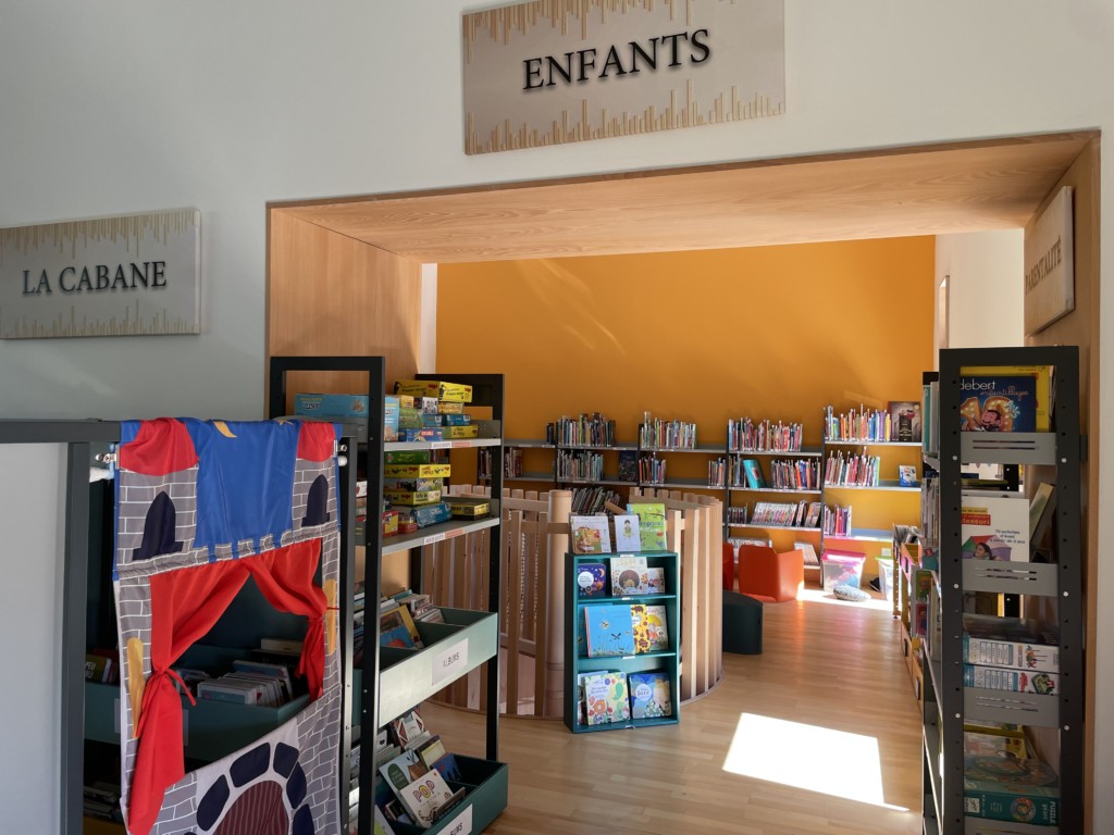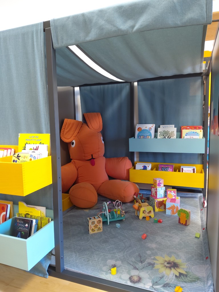 Un espace coloré leur est entièrement consacré, dans lequel ils peuvent trouver des albums, des jeux et jouets d’éveil. Il est attenant au rayon d’ouvrages parentalité.