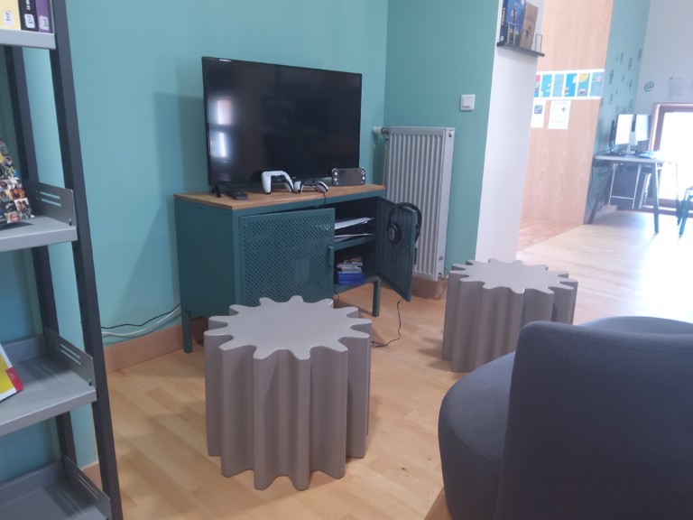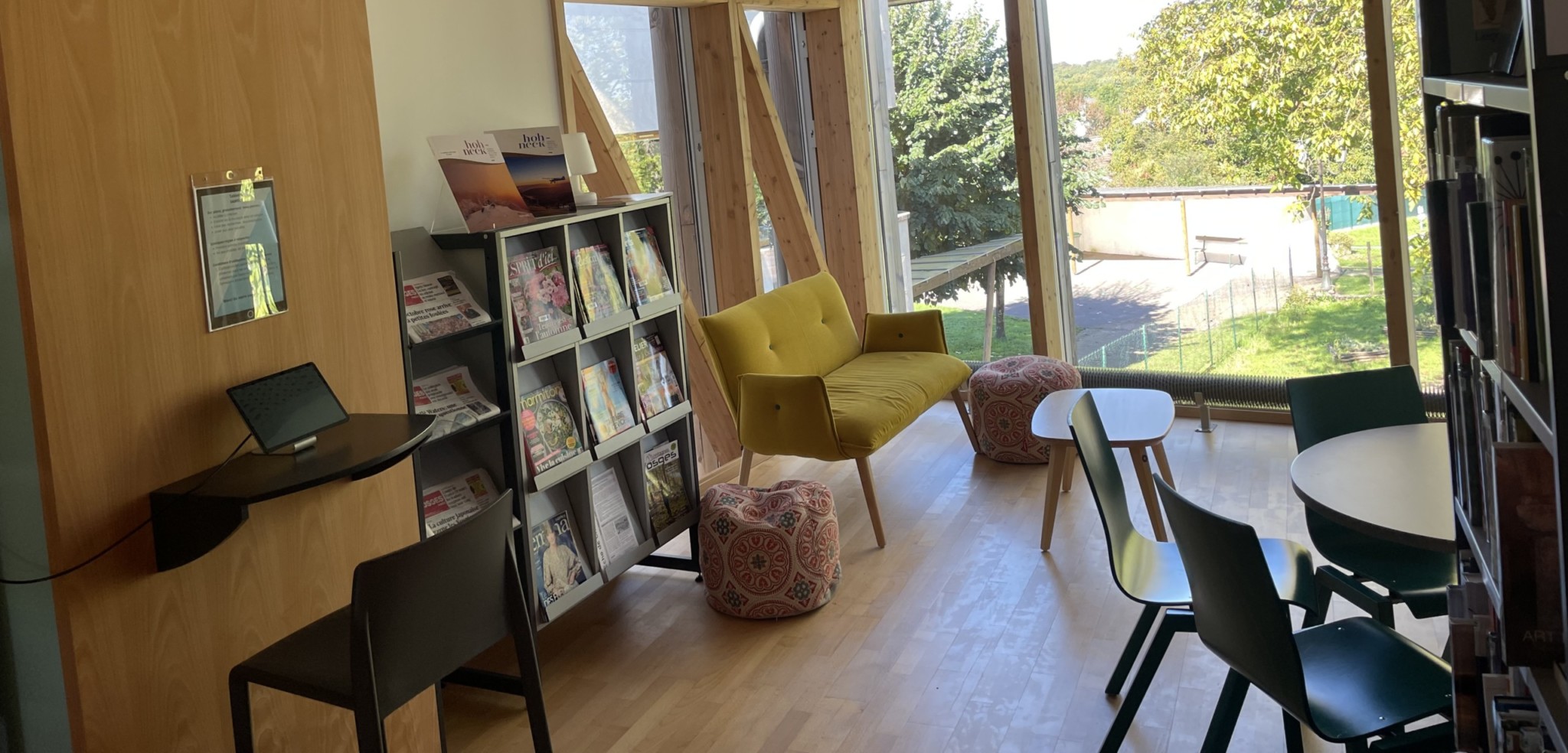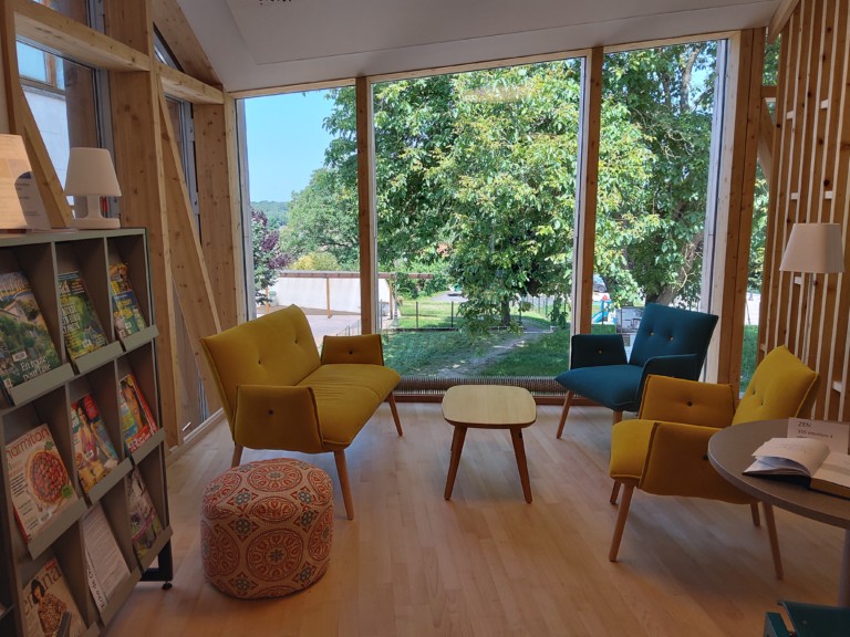 Un salon presse actualités, des chauffeuses et des tables permettent de consulter les ouvrages et revues sur place. On peut également y jouer aux jeux de société.