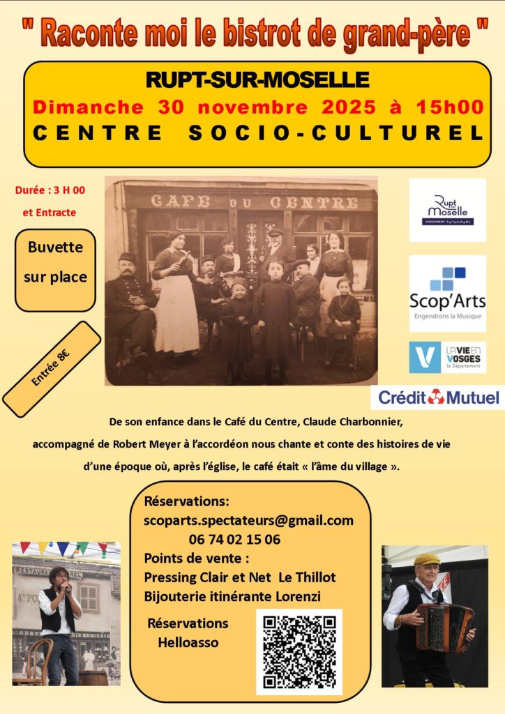 Sur scène, le bistrot sera reconstitué avec des décors plus vrais que nature et Claude Charbonnier laisse entrevoir que le public participera à sa façon au spectacle en venant sur scène, ou plutôt au bistrot, s’asseoir à une table pour, qui sait, y déguster un petit verre… Précisons que ce spectacle est un long conte musical qui s’étalera sur plus de deux heures… de plaisir.